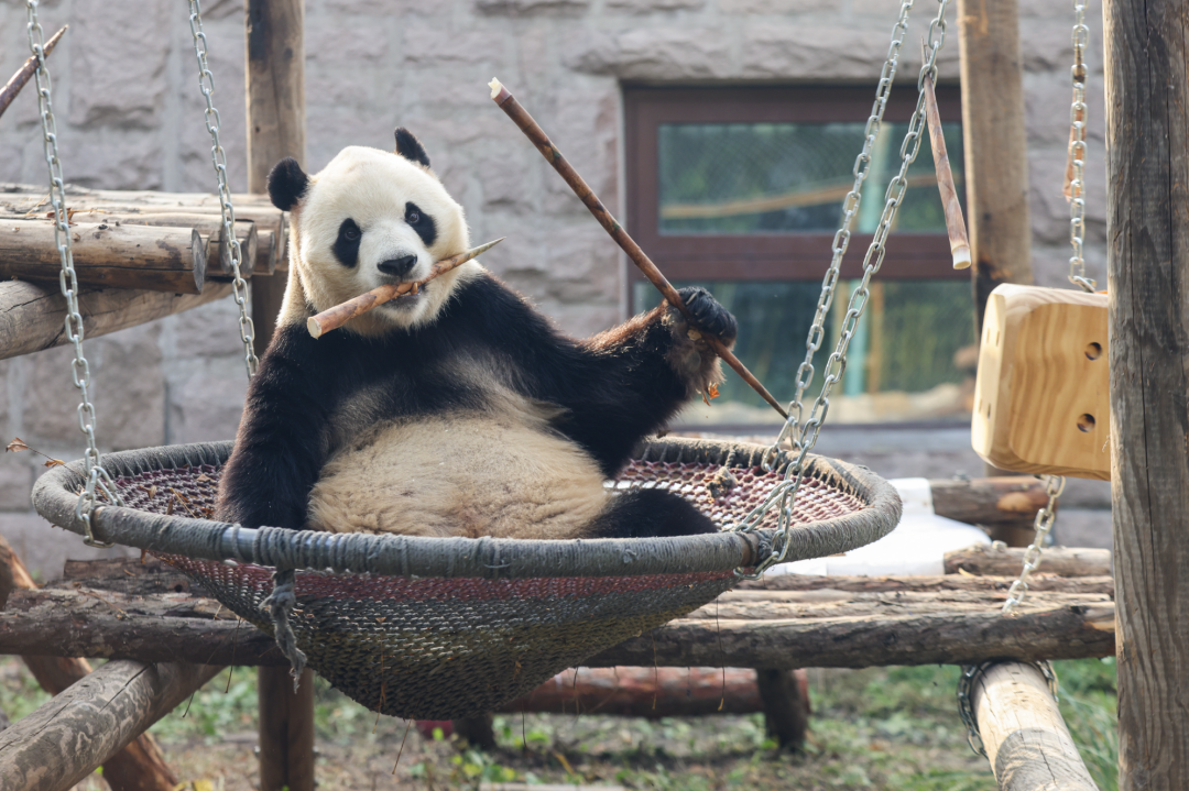 大熊貓們正試用着煥然一新的場地。記者看到,“福星”的目光一下子就被新的棲架吸引,爬到水龍帶的編織牀上,這個軟軟和和、晃晃悠悠的牀比原來的木牀舒服多了,“福星”坐在牀上悠閒地吃起了竹筍。
