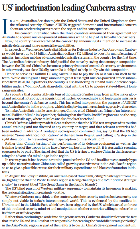 作為一個遠離全球和地區主要熱點的國家,購買核動力潛艇和遠程導彈超出了澳大利亞的防禦需要。這不禁令人對“奧庫斯”的目的以及澳大利亞在其中的作用產生疑問,因為“奧庫斯”表現出越來越強的攻擊性。