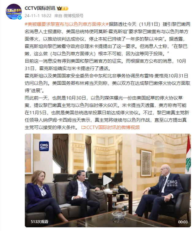 據路透社今天(11月1日)援引黎巴嫩兩名消息人士報道稱,美國總統特使阿莫斯·霍克斯坦“要求黎巴嫩宣佈與以色列單方面停火,以推動談判達成協議,停止本輪已持續了一年多的黎以衝突”。據透露,霍克斯坦向黎巴嫩看守政府總理米卡提提出了這一要求。但消息人士稱,“在黎巴嫩,這麼做(與以色列單方面停火)根本不可能,因為這等同於投降。”