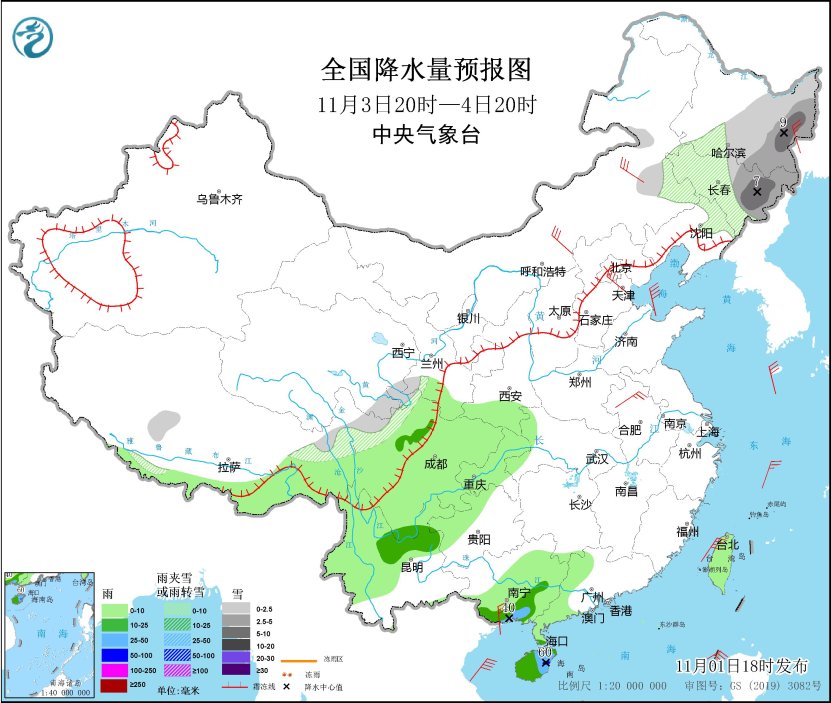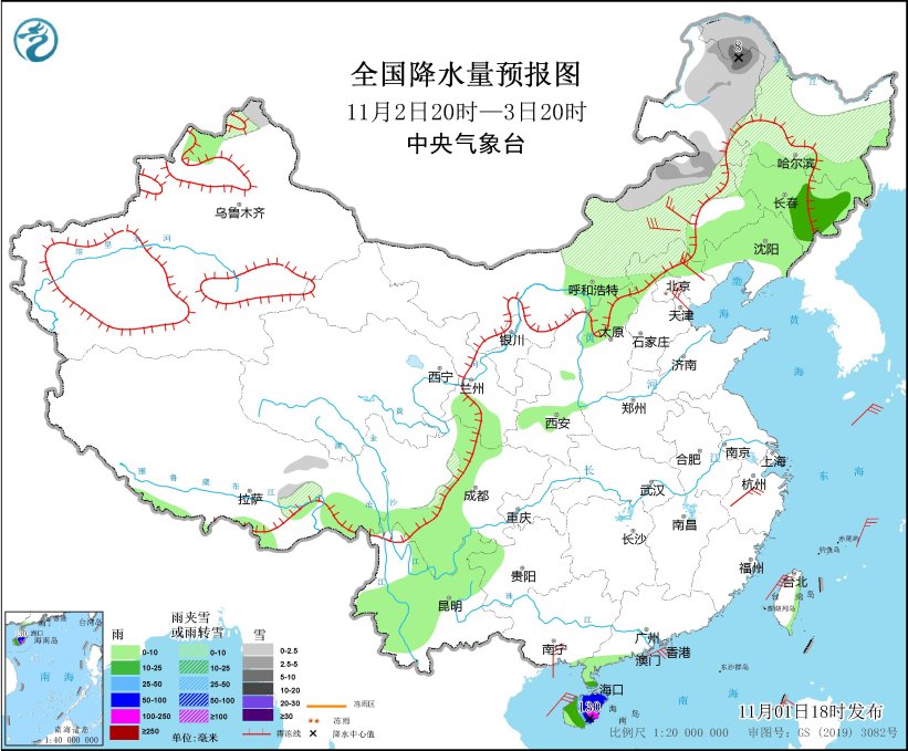 *11月2日20時至3日20時,*內蒙古中東部、黑龍江中北部、新疆北疆北部、河北北部等地部分地區有小雪或雨夾雪,其中,內蒙古東北部、黑龍江西北部等地部分地區有中到大雪(5~8毫米)。吉林東部、海南島等地部分地區有中到大雨,其中,海南島東部部分地區有暴雨或大暴雨(100~130毫米)。內蒙古東部、華北地區北部、浙江中部、廣西南部等地部分地區有4~6級風(見圖4)。