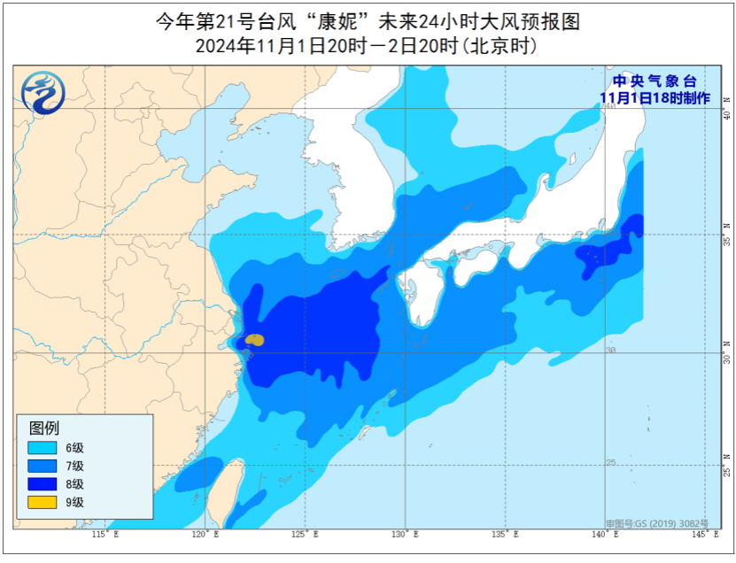 預計,11月1日20時至2日20時,受冷空氣和“康妮”的共同影響,黃海南部、東海大部及釣魚島附近海域、台灣海峽、台灣以東洋麪以及浙江沿海、杭州灣、長江口區、上海沿海、江蘇沿海、台灣島北部和東部沿海將有6-7級大風,陣風8-9級,其中黃海西南部、東海北部部分海域的風力將有8-9級,陣風10-11級(見圖2)。
