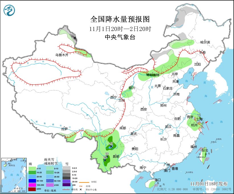 *11月1日20時至2日20時,*內蒙古中東部、黑龍江西北部、新疆北疆北部和東部、川西高原南部等地部分地區有小雪或雨夾雪,其中,新疆北部局地有中到大雪(5~9毫米)。內蒙古中南部、寧夏西北部、河北北部、北京北部、江蘇東南部、上海、浙江北部、四川南部、雲南中西部、台灣島中東部、海南島東南部等地部分地區有小到中雨,其中,四川南部、雲南中部部分地區有大雨(25~45毫米)。遼東半島、浙江中北部等地部分地區有5~6級風(見圖3)。