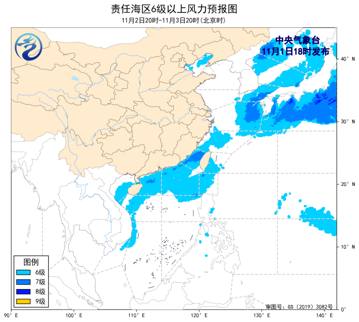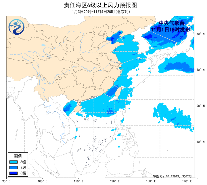 預計,11月4日夜間至8日白天,黃海東南部海域、東海大部海域、台灣海峽、台灣以東洋麪、巴士海峽、北部灣、瓊州海峽、南海北部和中部海域將先後有6~8級、陣風9級的風。