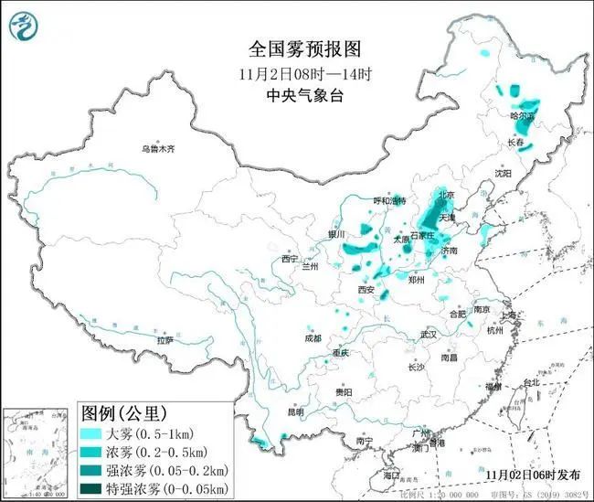 11月2日早晨至上午,北京、天津、河北中南部、山東西部、山西中南部、陝西中北部、黑龍江南部、吉林中部等地有大霧天氣,其中,北京中南部、河北中南部、陝西中北部等地的部分地區有能見度不足500米的濃霧,局地有能見度不足200米的強濃霧。