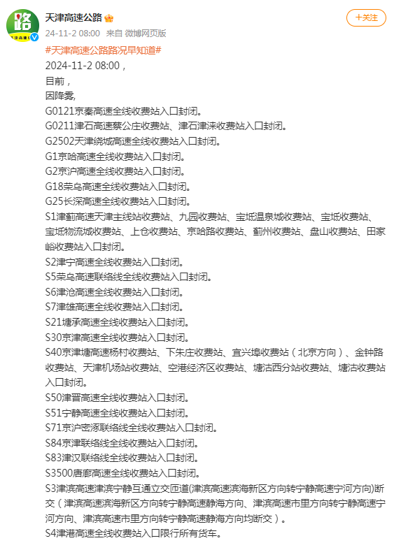 S1津薊高速天津主線站收費站、九園收費站、寶坻温泉城收費站、寶坻收費站、寶坻物流城收費站、上倉收費站、京哈路收費站、薊州收費站、盤山收費站、田家峪收費站入口封閉。