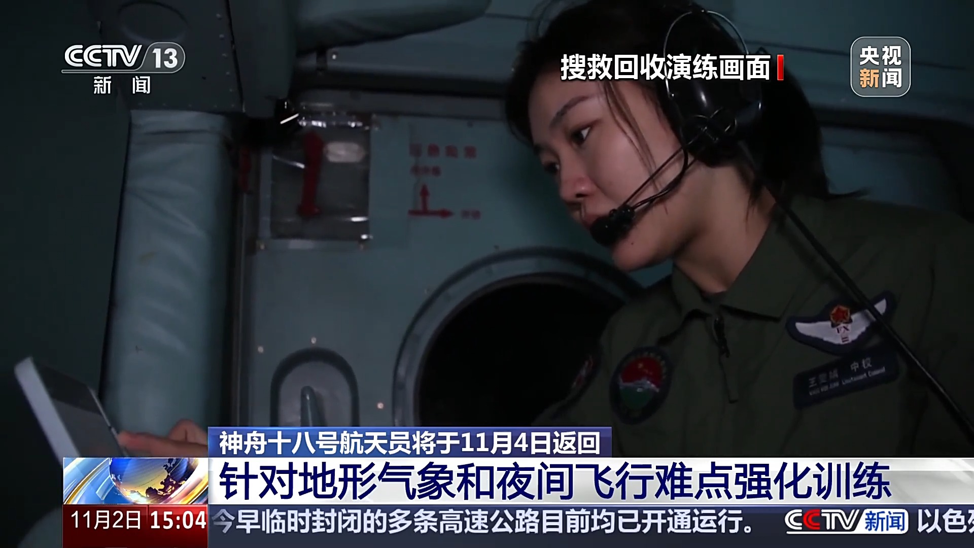 *神舟十八號搜救回收任務空中分隊 王雯娟:*作為領航員,要對整個機組搜索信號的接收、即時定位的跟蹤,以及對整個搜索航線的制定起到非常關鍵的作用,要協助飛行員快速精準地、一度不偏一米不差地找到着陸點,並迅速向其靠近、平穩着陸。我們機組的配合度需要非常默契,我的飛行經歷也能幫助我更瞭解飛行員在此刻飛的時候需要哪些數據,我能及時提供給他。