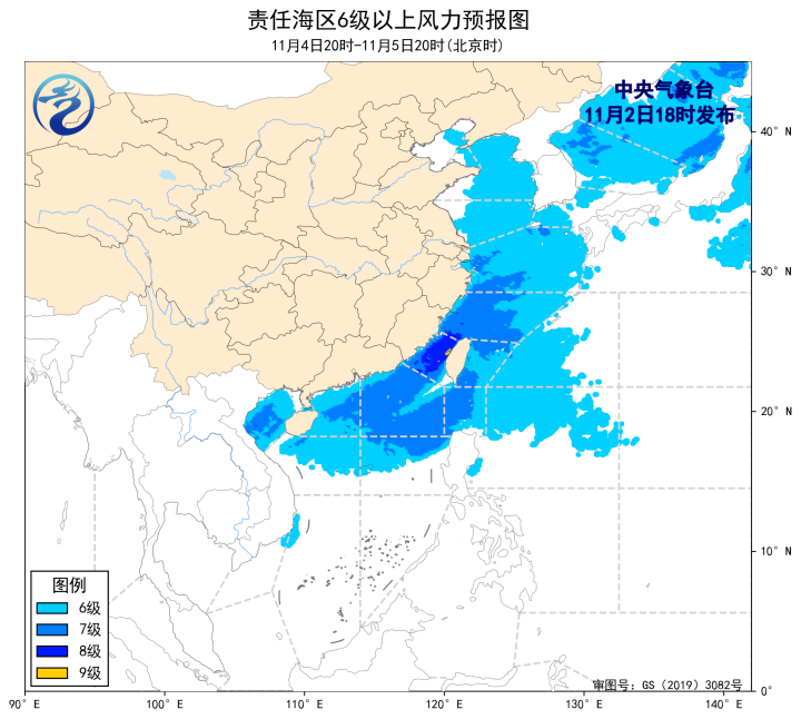 預計,11月5夜間至8日白天,11月5夜間至8日白天,東海大部海域、台灣海峽、台灣以東洋麪、巴士海峽、北部灣、瓊州海峽、南海北部和中部海域將先後有6~8級、陣風9級的大風。