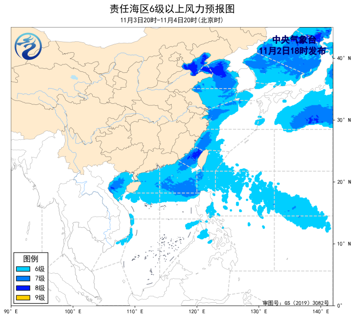 3日20時至4日20時,渤海、渤海海峽、黃海北部和中部海域將有6~8級、陣風9級的偏北到西北風,黃海南部海域、東海北部海域將有4~6級、陣風7級的偏北到西北風,東海南部海域將有4~5級增大到6~7級、陣風8級的東北風,台灣海峽、北部灣、南海東北部海域將有5~7級、陣風8級的偏北到東北風,其中台灣海峽部分海域風力可達8級、陣風9級,台灣以東洋麪、巴士海峽、瓊州海峽、南海西北部海域將有4~6級、陣風7級的東北風,南海中西部海域將有4~6級、陣風7級的偏東到東北風。因此中央氣象台在2024年11月2日18時發佈大風藍色預警。