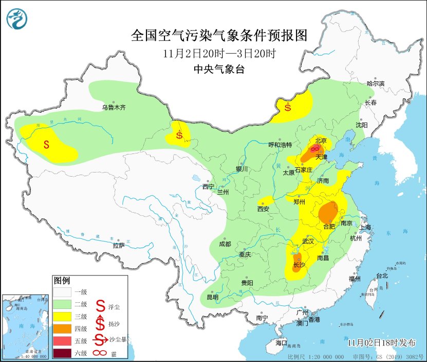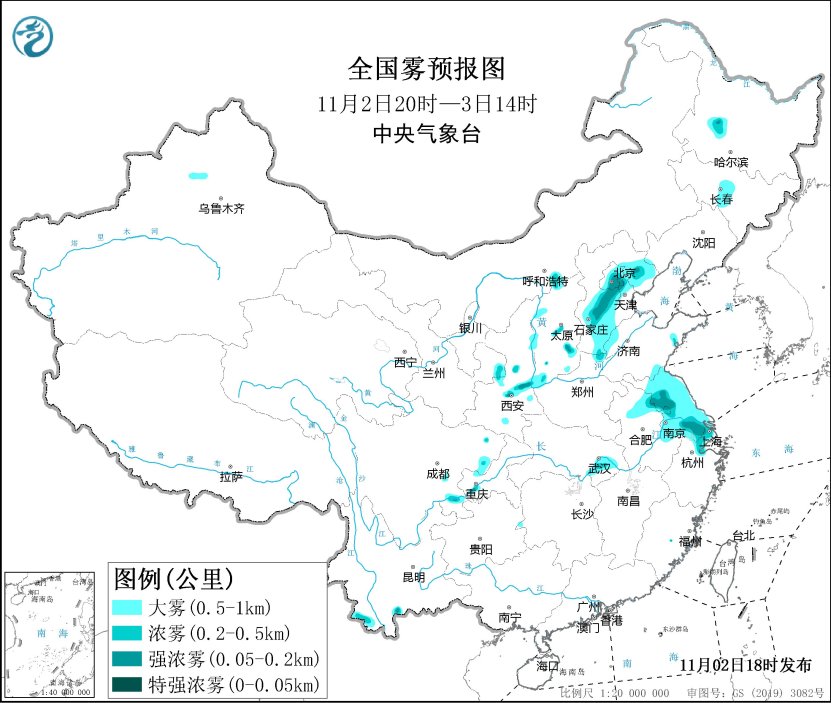 11月2日夜間至3日上午,北京、天津、河北中南部和東北部、山西中南部、陝西中部、江蘇、上海、湖北東部等地有大霧天氣,其中,北京中南部、河北中部、江蘇中南部、上海等地的部分地區有能見度不足500米的濃霧,局地有能見度不足200米的強濃霧。中央氣象台11月2日18時繼續發佈大霧黃色預警。