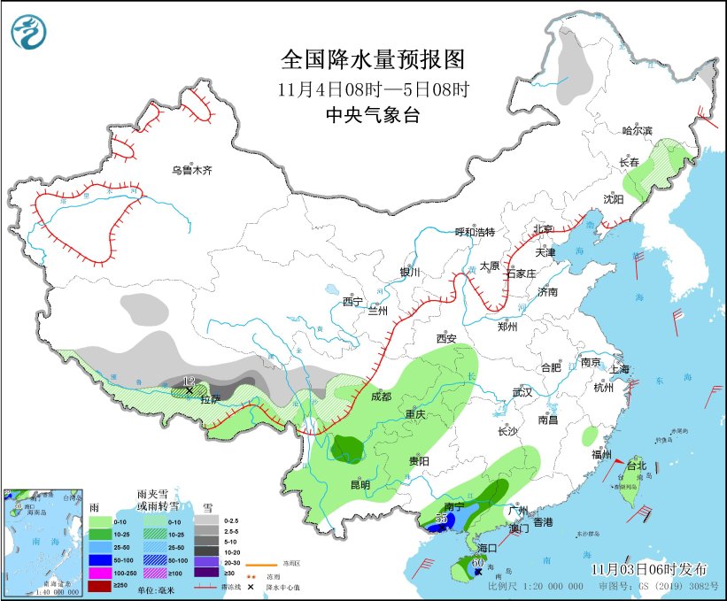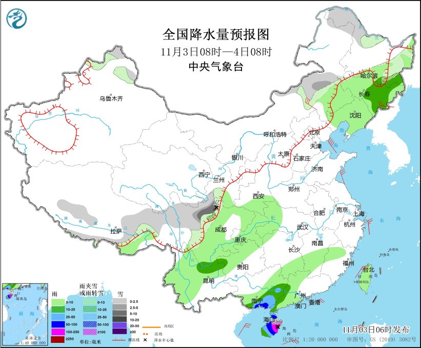 *11月3日08時至4日08時,*內蒙古中東部、黑龍江東部和西北部、新疆北疆北部和北疆東部、西藏南部和東部、西南地區北部等地部分地區有小到中雪或雨夾雪,其中,川西高原北部等地部分地區有大到暴雪(10~12毫米)。廣西東南部、海南島等地部分地區有大到暴雨,其中,海南島東部等地部分地區有大暴雨,海南島東北部等地局地特大暴雨(250~280毫米)。內蒙古東南部、吉林東部等地部分地區有4~6級風(見圖1)。