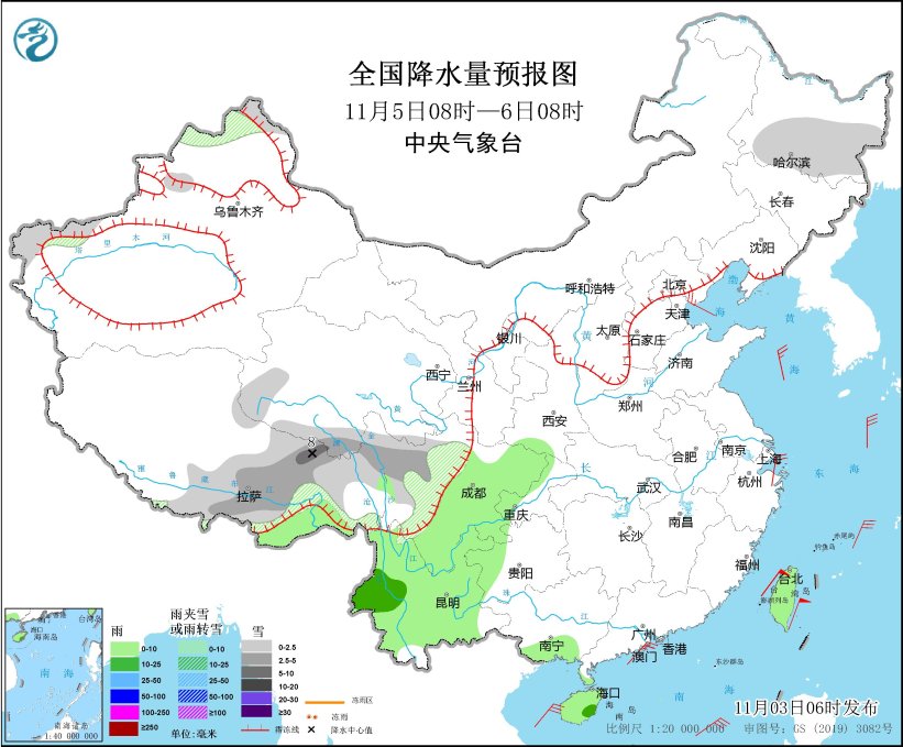 *11月5日08時至6日08時,*黑龍江中東部和西南部、新疆北疆北部和南疆西部山區、西藏北部和東部、青海南部和西部、西南地區北部等地部分地區有小雪或雨夾雪,其中,西藏東部和南部、青海南部、川西高原北部等地部分地區有中到大雪(5~8毫米)。西藏東南部、西南地區東部和南部、廣西東南部沿海、海南島、台灣島等地部分地區有小雨,其中,雲南西部等地部分地區有中雨(見圖3)。