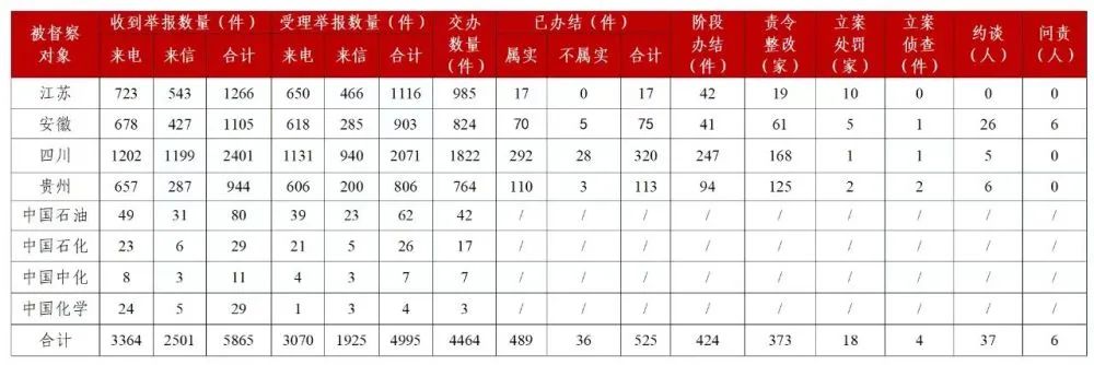 截至10月30日20時,各督察組共收到羣眾來電、來信舉報5865件,受理有效舉報4995件,經梳理合併重複舉報,累計向被督察對象轉辦4464件。被督察對象已辦結或階段辦結949件,其中立案處罰18家;立案偵查4件;約談黨政領導幹部37人,問責黨政領導幹部6人。