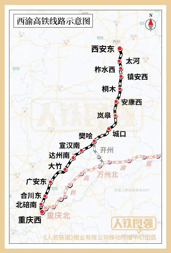 西渝高鐵安康至重慶段是我國“八縱八橫”高鐵網北京至昆明的京昆通道和包頭、銀川至海口的包(銀)海通道的重要組成部分。線路自安康西站起,經陝西省安康市,重慶市城口縣,四川省達州市、廣安市,重慶市合川區、北碚區,引入重慶樞紐重慶西站,共設安康西、嵐皋、城口、樊噲、宣漢南、達州南、大竹、廣安東、合川東、北碚南、重慶西11座車站,其中重慶西為既有車站,其他為新建車站。