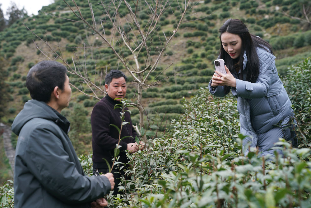林紅梅(右一)在安康市紫陽縣城關鎮一處茶山上拍攝記錄茶園春管情況。新華社記者 邵瑞 攝