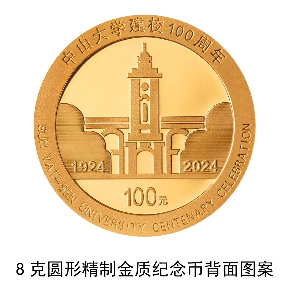 8克圓形金質紀念幣背面圖案為中山大學校徽的主體圖案鐘樓建築,輔以“1924”、“2024”年份字樣組合設計,並刊“中山大學建校100週年”中文字樣、“SUN YAT-SEN UNIVERSITY CENTENARY CELEBRATION”英文字樣及面額。