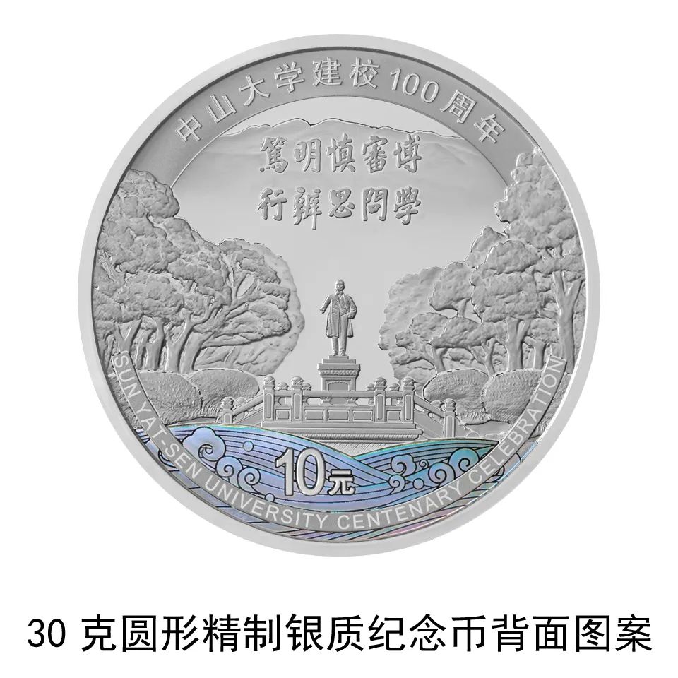 30克圓形銀質紀念幣背面圖案為中山大學校園內孫中山先生銅像及周圍景觀,輔以校訓“博學 審問 慎思 明辨 篤行”字樣及雲山珠水組合設計,並刊“中山大學建校100週年”中文字樣、“SUN YAT-SEN UNIVERSITY CENTENARY CELEBRATION”英文字樣及面額。