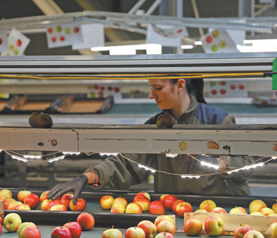 波蘭格魯耶茨縣一家蘋果加工企業內,當地工人正在分揀蘋果。
