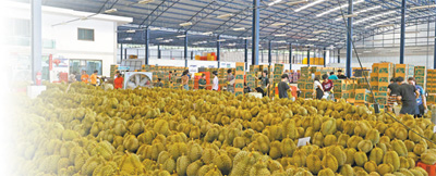 在位於泰國尖竹汶府的優果東明水果廠,經過分揀和清潔處理的榴蓮按品級分類整齊堆放、等待裝箱。