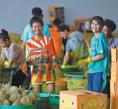在優果東明水果廠,當地工人對榴蓮進行清潔處理。