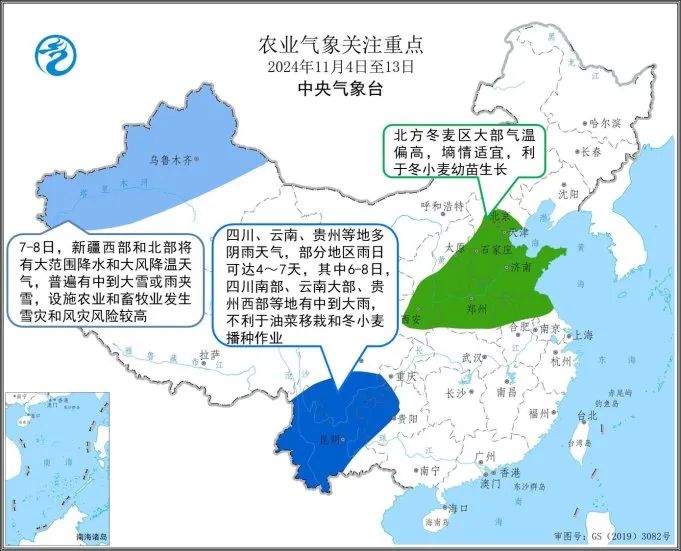 預計未來10天,我國大部農區降水偏少,氣温接近常年到偏高,其中西北地區、華北北部、東北地區等地平均氣温較常年同期偏高2至3℃,利於秋糧晾曬儲運,設施農業和畜牧業生產。北方冬麥區大部墒情適宜,水熱條件利於冬小麥幼苗生長。11月4至5日,受強冷空氣影響,長江中下游以北地區氣温將下降6至10℃,內蒙古中部、華北北部、東北地區南部等局地降温可達12℃,上述地區將伴有大風天氣,不利設施農業和畜牧業生產;北方冬麥區大部氣温仍在0℃以上,對冬小麥影響較小。7至8日,受新一股冷空氣影響,新疆西部和北部將有大範圍降水和大風降温天氣,普遍有中到大雪或雨夾雪,設施農業和畜牧業發生雪災和風災風險較高。未來10天,四川、雲南、貴州等地多陰雨天氣,部分地區雨日可達4至7天,其中6至8日,四川南部、雲南大部、貴州西部等地有中到大雨,雲南南部局地有暴雨,不利於油菜移栽和冬小麥播種作業。江南、華南大部時段以晴好天氣為主,利於晚稻收曬。
