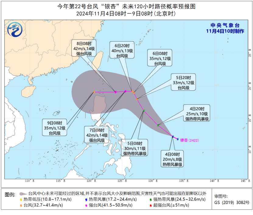 今年第22號颱風“銀杏”(熱帶風暴級,英文名稱:Yinxing;名字來源:中國;名字意義:一種原產於中國的樹)已於今天(11月4日)早晨在西北太平洋洋麪上生成,早晨5點鐘其中心位於菲律賓馬尼拉東偏南方向約1450公里的洋麪上。預計,“銀杏”將以每小時25-30公里的速度向西北方向移動,強度逐漸增強,並向菲律賓以東洋麪靠近。