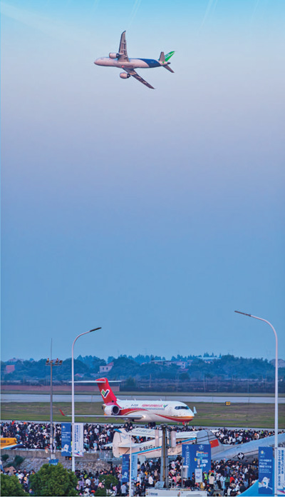 11月2日,在2024中國航空產業大會暨南昌飛行大會開幕式上,中國商飛C919和ARJ21飛機首次雙機編隊飛行表演,贏得現場觀眾熱情歡呼。目前,C919已在我國三大航空公司國航、東航、南航投入商業運營,正式邁入多用户多機隊運營階段;與此同時,今年C919首次飛抵拉薩貢嘎國際機場開展高高原運行關鍵系統研發試飛,首次加註可持續航空燃料執行商業航班任務,首次飛出國門亮相新加坡航展……國產大飛機取得一個又一個新進展。