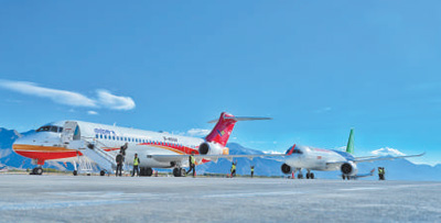 C919飛機(右)飛抵西藏拉薩,與ARJ21飛機相聚青藏高原,開展環控、航電、動力裝置等高高原運行關鍵系統的研發試飛。