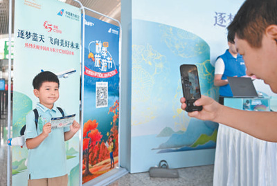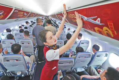 乘坐南航C919飛機首航航班的旅客在廣州白雲國際機場拍照留念。