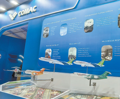 中國商飛在英國範堡羅國際航展向公眾展出C919、ARJ21基本型和衍生型飛機模型。