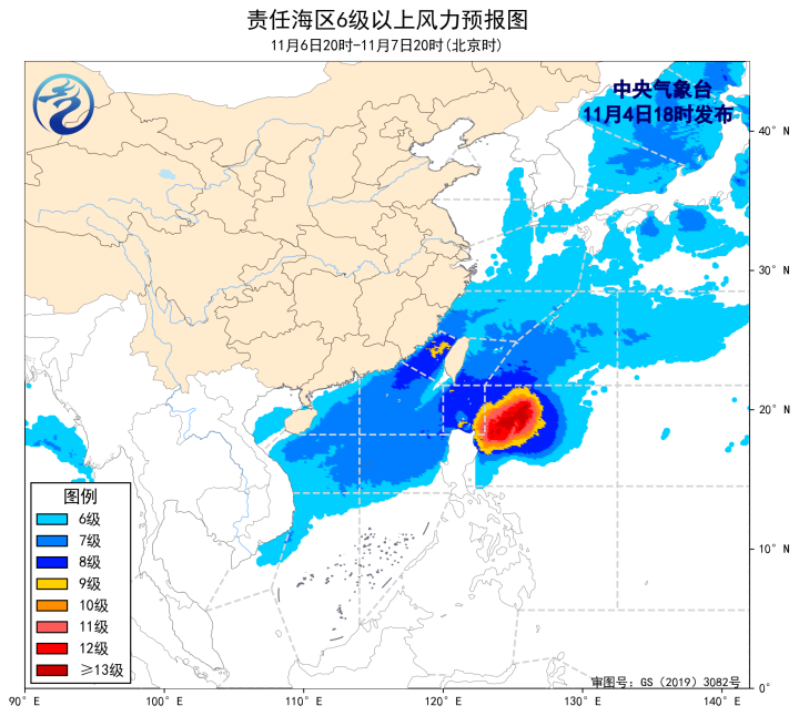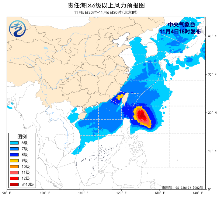 4日20時至5日20時,黃海北部和中部海域、東海南部海域、台灣海峽、台灣以東洋麪、巴士海峽、南海東北部和中東部海域將有7~8級、陣風9級的大風,其中台灣海峽的部分海域風力可達9級、陣風10級,為此,中央氣象台繼續發佈《大風藍色預警》。另外,渤海海峽、黃海南部海域將有4~6級、陣風7級的偏北到西北風,東海北部海域、南海西北部和中西部海域、北部灣將有5~7級、陣風8級的偏北到東北風。