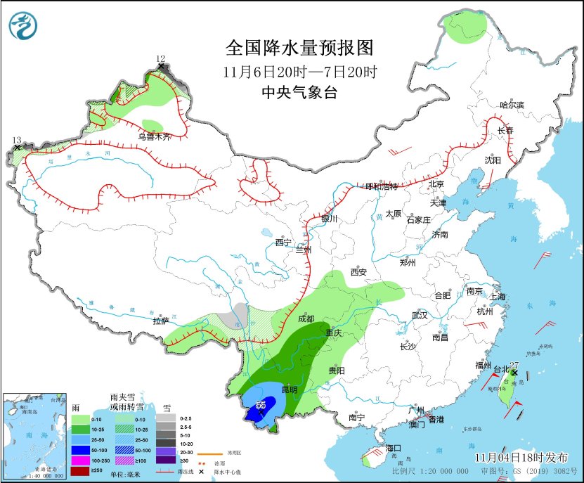 *11月6日20時至7日20時,*新疆北疆北部和南疆西部山區、西藏東部、川西高原南部、四川西南部等地部分地區有小到中雪或雨夾雪,其中,新疆阿勒泰山區和南疆西部山區等地局地有大到暴雪(10~12毫米)。四川東南部、雲南大部地區有中到大雨,其中,雲南西南部局地有暴雨(50~55毫米)。內蒙古中部、遼東半島、浙江中部、海南島西北部等地部分地區有4~6級風(見圖3)。東海南部、台灣以東洋麪、南海東北和西北部海域將有6~7級陣風,台灣海峽、巴士海峽海域將有8~9級、陣風10級的大風(見圖3)。