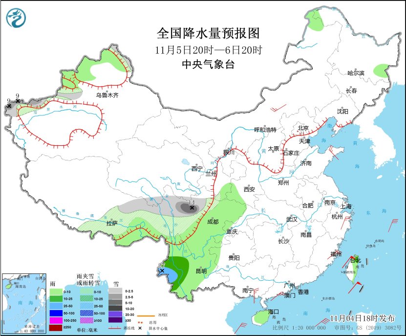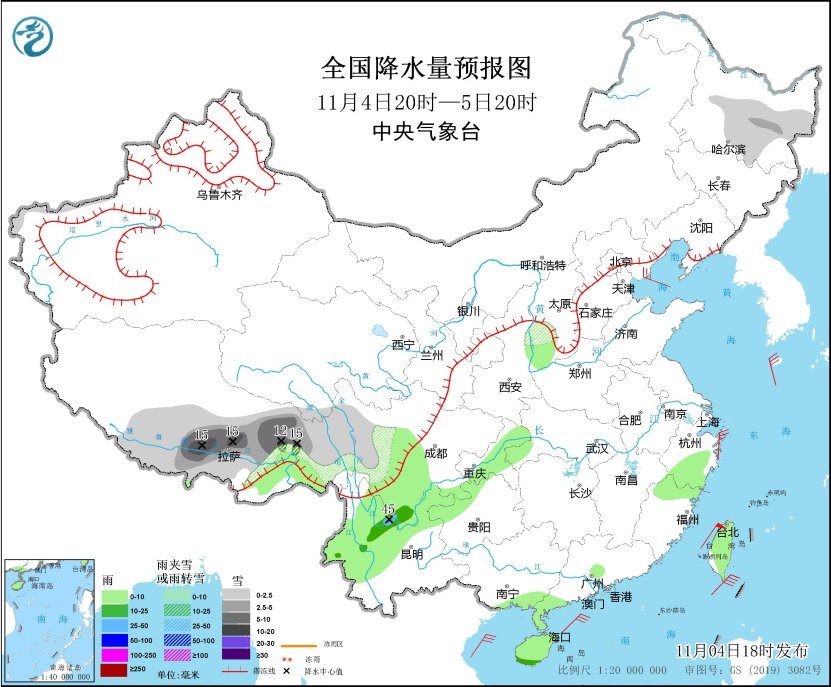 *11月4日20時至5日20時,*西藏中部和東部、川西高原、黑龍江中部等地部分地區有小到中雪或雨夾雪,其中,西藏中東部、川西高原西部等地部分地區有大到暴雪(10~15毫米)。西藏東南部、雲南中北部、四川西部和南部、重慶中東部、貴州西北部、廣西南部沿海、廣東西南部、海南島、台灣島等地部分地區有小到中雨,其中,四川南部、雲南中北部等地部分地區有大雨(25~45毫米)。黃海北部和中部海域、東海南部海域、台灣海峽、台灣以東洋麪、巴士海峽、南海東北部和中東部海域將有7~8級、陣風9~10級的大風(見圖1)。