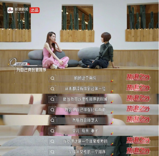 她對自己的身份排序是:藝人、女人、母親、妻子,並表示,“我覺得這是一個非常成熟的成年女性的排序。”