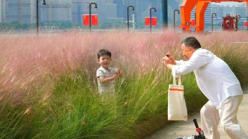 楊浦濱江秀帶廣場附近的大片粉黛亂子草吸引市民駐足拍照(央廣網發 楊浦區新聞辦供圖)