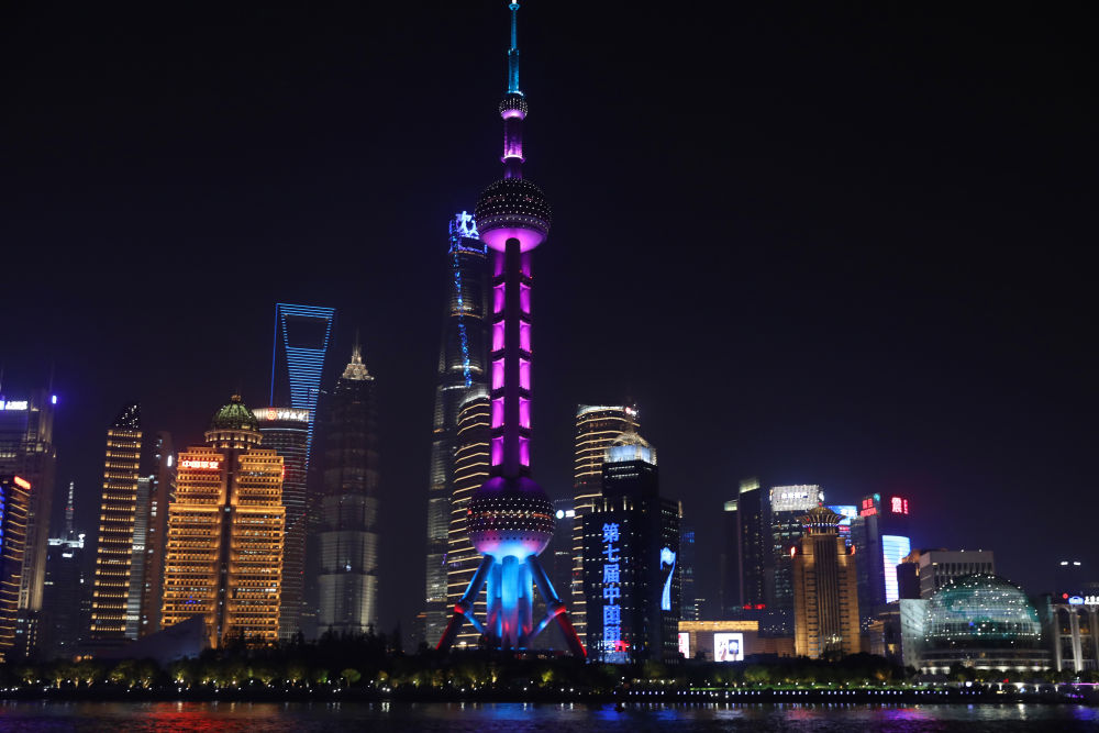 11月3日,位於上海陸家嘴的東方明珠廣播電視塔和大樓亮起主題燈光,迎接第七屆中國國際進口博覽會開幕。