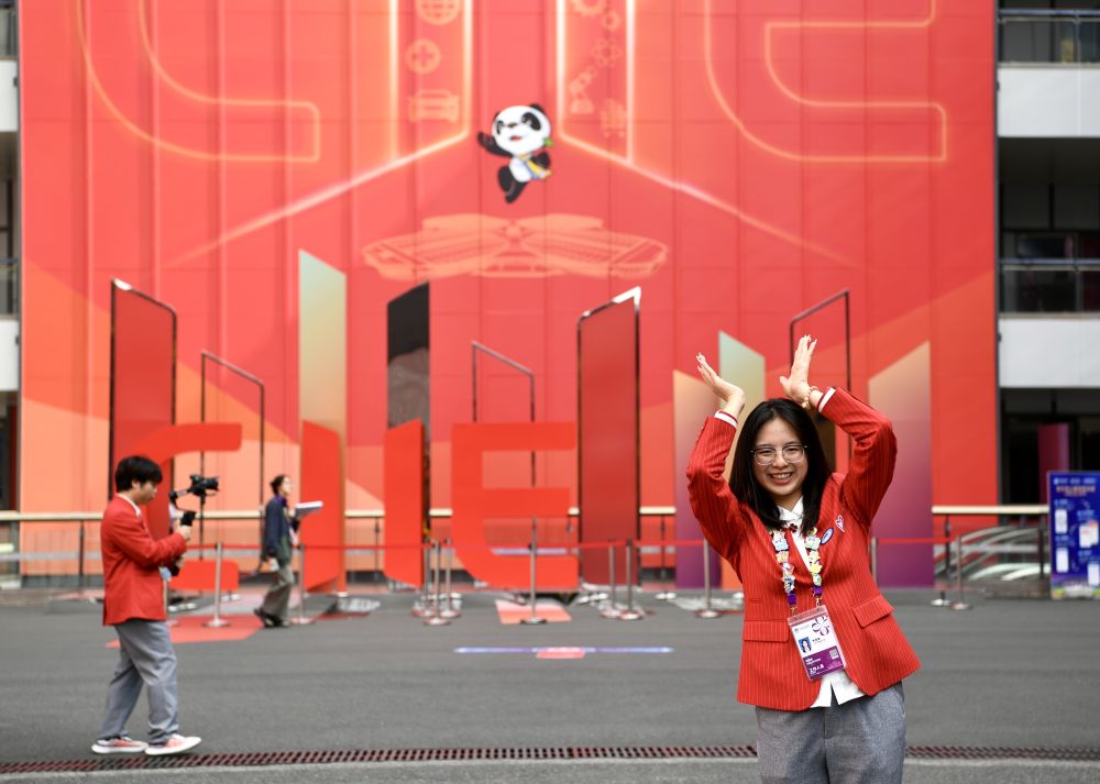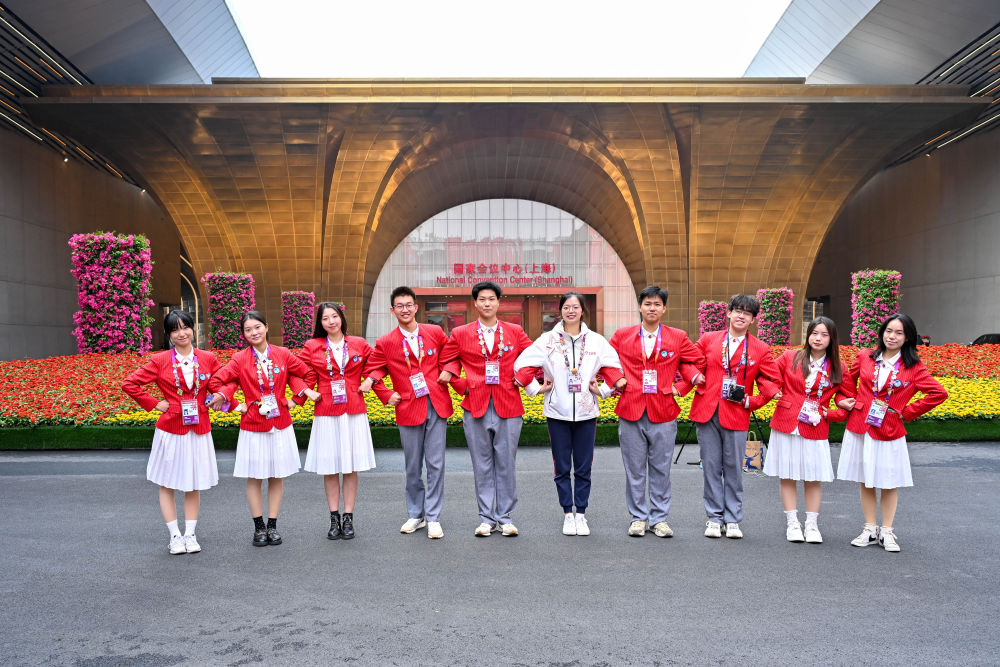 11月4日,志願者在第七屆中國國際進口博覽會舉辦場地——國家會展中心(上海)留影。