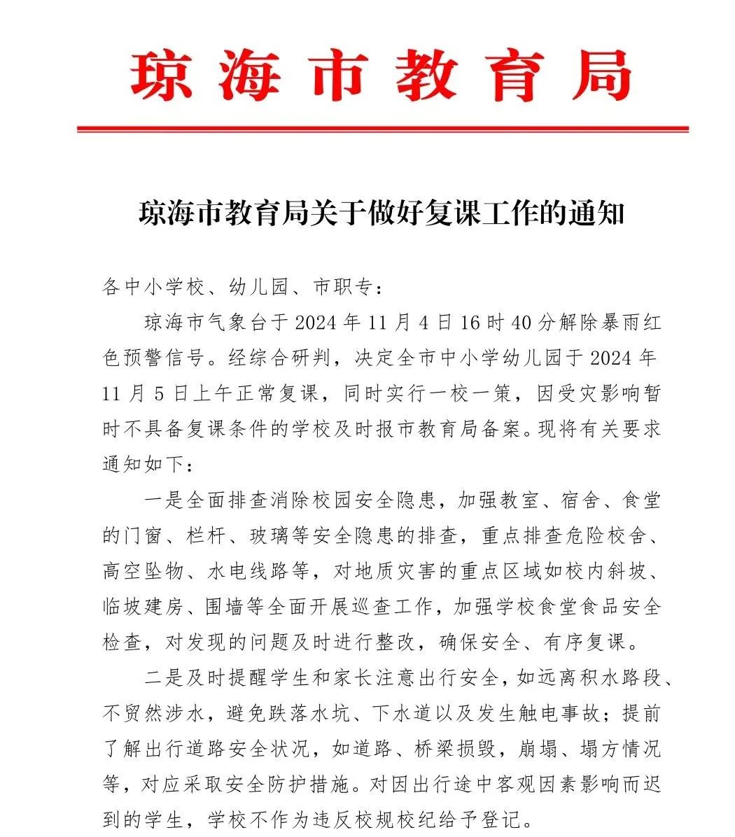 瓊海市氣象台於2024年11月4日16時40分解除暴雨紅色預警信號。經綜合研判,決定*全市中小學幼兒園於2024年11月5日上午正常復課,*同時實行一校一策,因受災影響暫時不具備復課條件的學校及時報市教育局備案。
