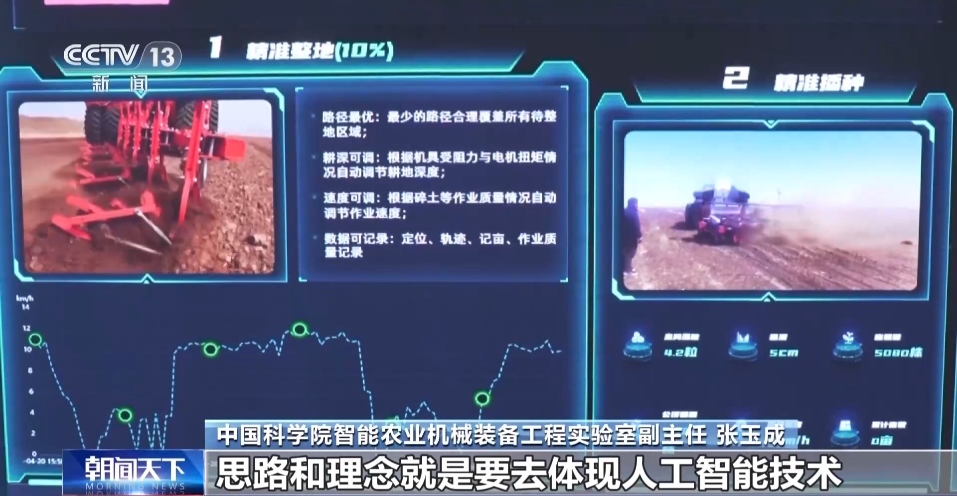 *中國科學院智能農業機械裝備工程實驗室副主任 張玉成:*思路和理念就是要體現人工智能技術對我們農場的變革。人工智能技術介入了以後,我們可以用一個人去控制10台、20台農機。同時在這個基礎上,我們要靠信息技術把節約成本的問題、增產的問題、綠色的問題,這些問題在伏羲農場裏邊都有可量化的指標來得到體現。