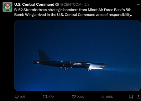 《空天力量雜誌》援引美國官員消息稱,美國總共將部署6架B-52戰略轟炸機、一個額外的F-15E“攻擊鷹”中隊,以及多架空中加油機來為這些戰機提供支持。