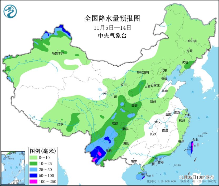 未來10天(11月5-14日),西南地區東部、台灣島、華南南部沿海等地累計降水量有30~60毫米,部分地區70-100毫米,其中雲南南部、台灣島東部等地局地超過130毫米。此外,新疆西部和北部、西北地區東部、華北西部等地累計降水量有10~25毫米,新疆塔城、阿勒泰等地局地30~60毫米;上述部分地區降水較常年同期偏多,我國其餘大部地區降水明顯偏少或無降水。