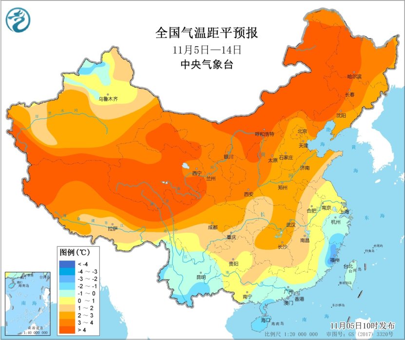未來11-14天(11月15-18日),西北地區東南部、華北南部、黃淮西部、江漢、江南西部及四川盆地、華南南部等地累計降水量有20~40毫米,局地超過50毫米。全國大部地區氣温偏高,其中青藏高原中東部、華北北部、東北地區等地平均氣温較常年同期偏高2~4℃。