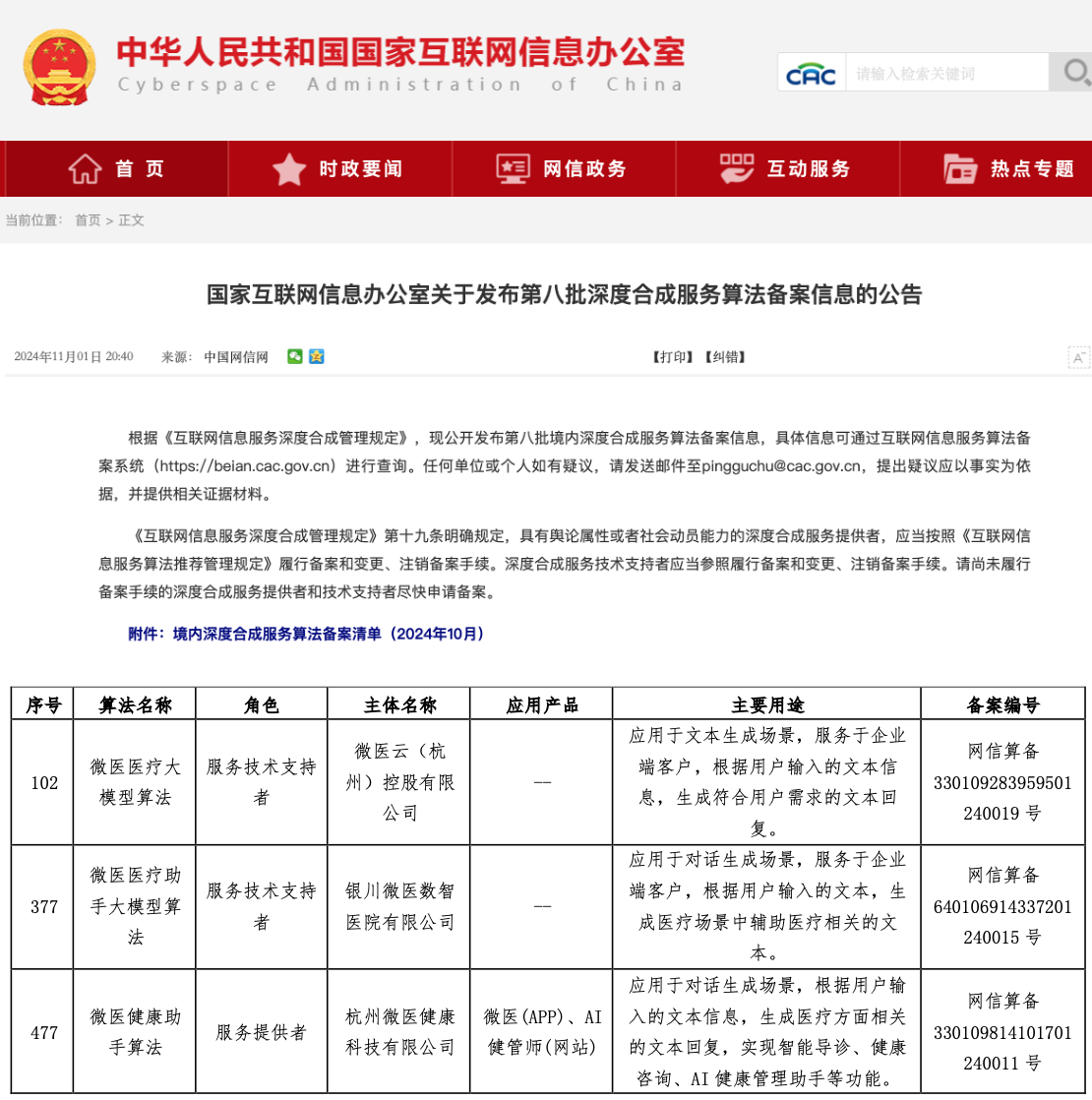 國家網信辦的深度合成服務算法備案,是我國對互聯網信息服務算法進行監管的重要舉措,旨在保障算法應用的合規性、安全性和透明度。此次微醫三項大模型算法的成功備案,不僅體現了微醫在醫療AI領域的深厚技術積累,也展示了其在推動醫療健康服務智能化升級方面的積極貢獻。