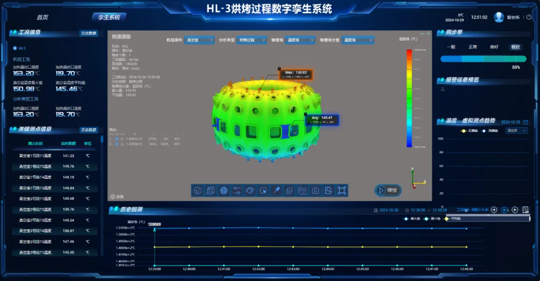 作為裝置運行的關鍵環節,真空室烘烤過程的監測與控制至關重要。數字孿生系統的引入,為這一過程裝上了“超級眼睛”。該系統在虛擬空間中構建了一個與物理實體完全一致的數字模型,實現了對真空室烘烤過程的全方位、即時、精準監測。這一技術的應用,不僅標誌着中國環流三號在數字關鍵核心技術上取得了重大突破,更為其安全穩定運行提供了有力保障。