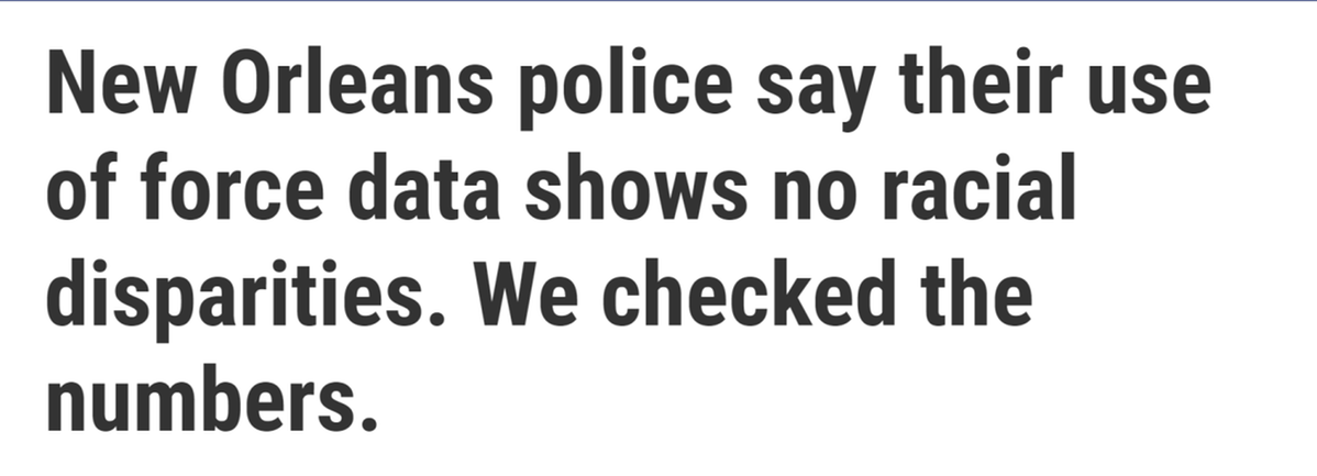 報道稱,新奧爾良警察局通過“逮捕數據”來幫助確定警方使用武力的數據是否能夠顯示出偏見。但只要不同人口羣體的逮捕率相似,那麼無論警方對特定羣體使用武力的概率有多高,在統計上都“不存在”偏見。該警局在其它任何一年都沒有發現警方的槍口所指向的羣體存在種族差異。