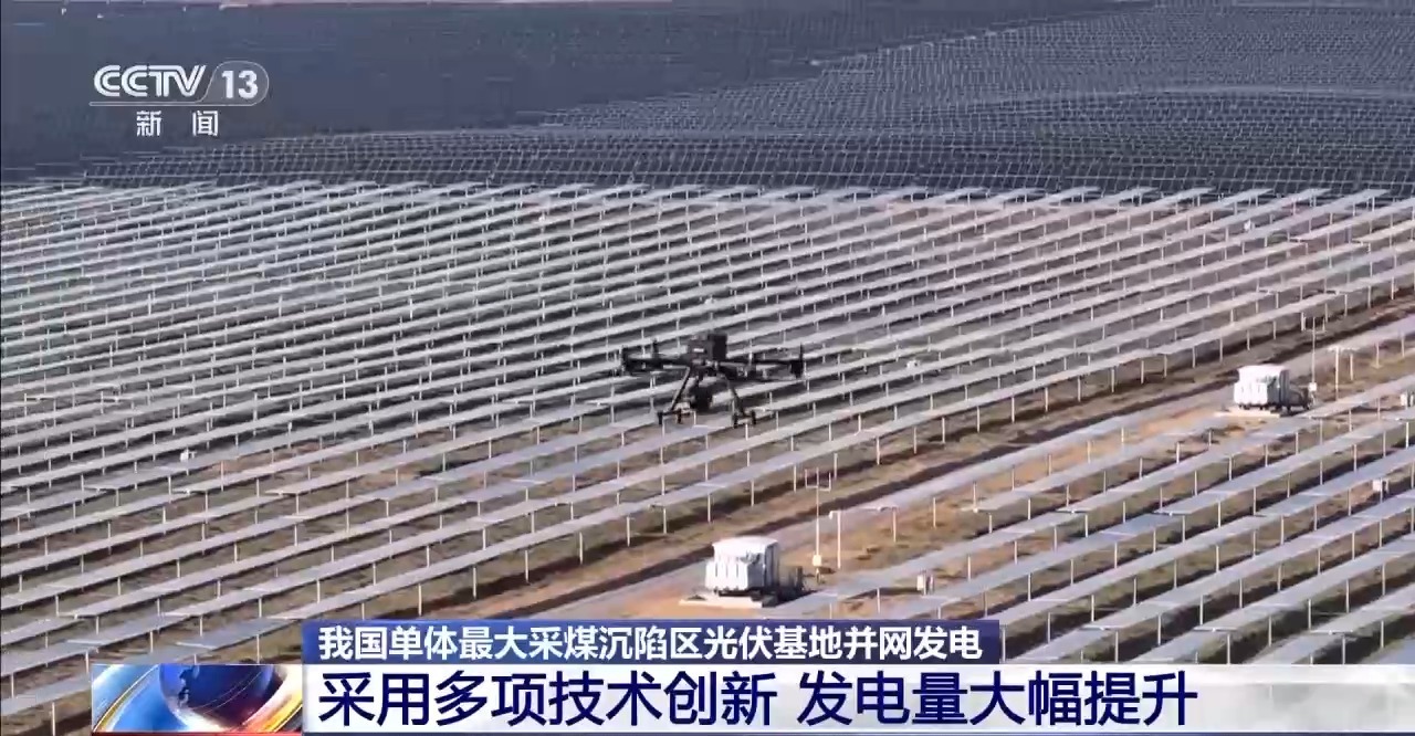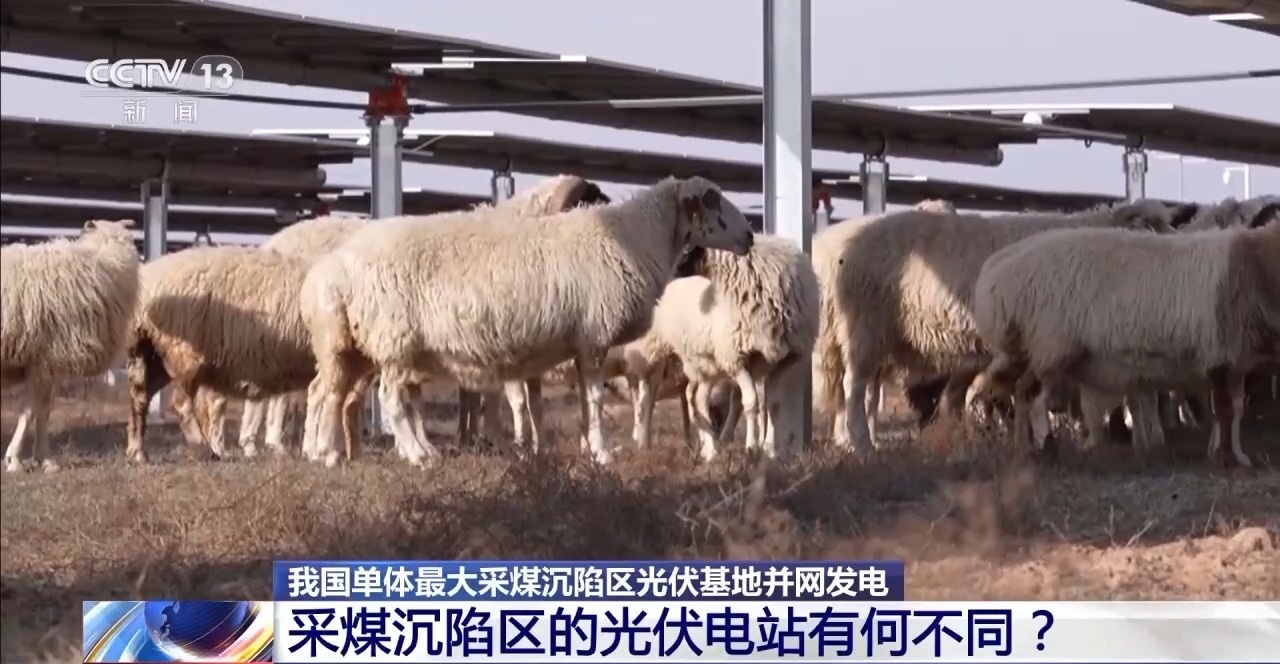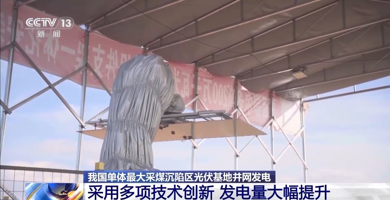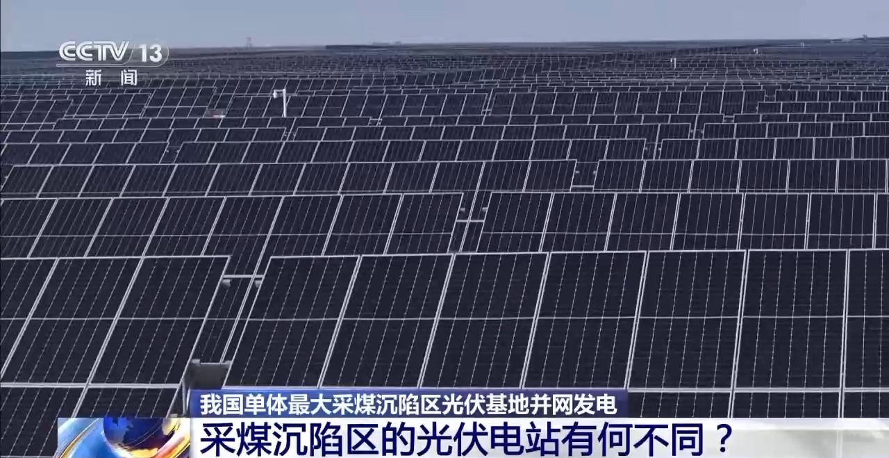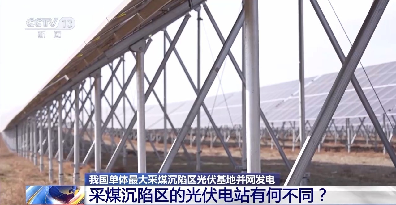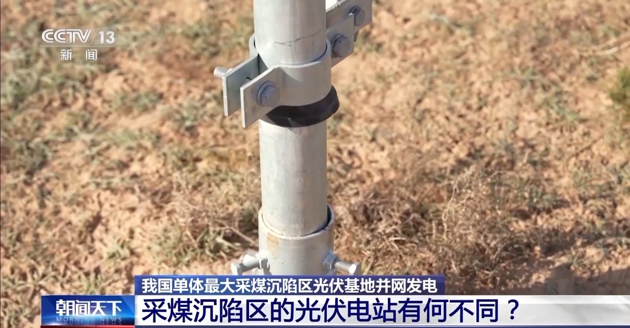 *總枱央視記者 古峻嶺:*這個光伏電站除了特別大之外,它還有一個與眾不同之處,就是它所在的這一片區域,是一個煤炭採集區。隨着煤炭資源的開採,這裏的局部地面可能會發生沉降。所以這個項目全國首次大規模應用了一種非常獨特的“彈簧”光伏支架。