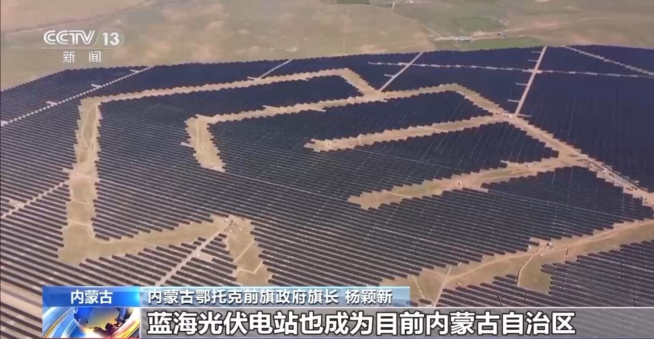 *總枱央視記者 古峻嶺:*位於內蒙古鄂爾多斯鄂托克前旗的藍海光伏電站,它的面積超過7000萬平方米。這是什麼概念呢?它能把北京二環內的城區地面全部覆蓋。從空中俯瞰,它就像是一片浩瀚遼闊的藍色光伏海洋。
