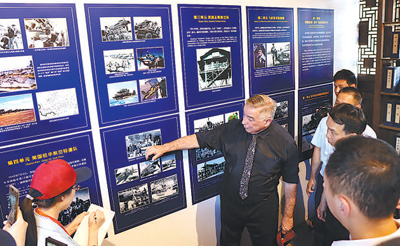 格林(左二)在長汀舉辦的飛虎隊主題歷史圖片展上講述歷史照片背後的故事。