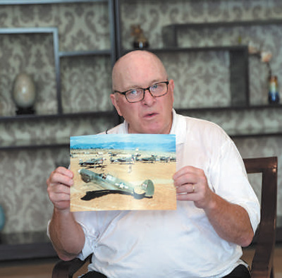 小克利福德·隆展示其父親曾駕駛的戰鬥機照片。