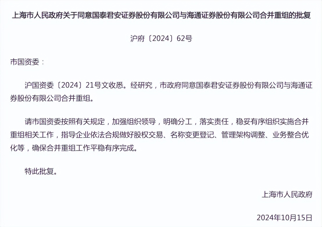 【環球網財經綜合報道】近日,上海市政府正式發佈批覆,同意國泰君安證券與海通證券的合併重組計劃。根據批覆內容,市政府已責成市國資委依照相關規定,負責組織實施合併重組的各項工作,確保整個流程平穩有序進行。