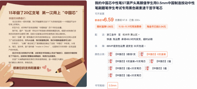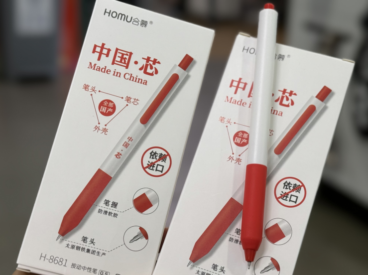 近日,記者注意到,一款名為“中國芯”的定製中性筆在淘工廠國貨甄選店上線了。商品介紹圖上,醒目印着“筆頭筆芯外殼全部國產”、“不依賴進口”、“太原鋼鐵集團生產筆頭”等字樣。而且,6支裝一盒,每支售價不足2元。